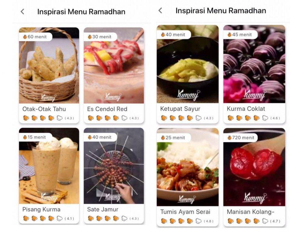 Yummy app memiliki fitur resep dengan kategori yang beragam, termasuk resep-resep khusus bulan suci Ramadan. Mulai dari ide menu sahur, berbuka puasa, kue lebaran sampai takjil buat ide jualan pun tersedia. Kamu bisa memilih aneka menu berdasarkan bahan-bahan yang ada di kulkas dan selera makanan kesukaan. Jadi makin mudah deh #MasakDiRumahAja