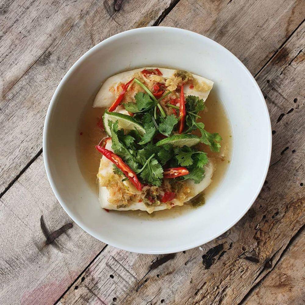 4. Tim ikan biasanya dibuat dari ikan nila atau kerapu yang dimarinasi dengan bumbu oriental, seperti tauco dan minyak wijen. Dagingnya sangat lembut karena dikukus hingga matang