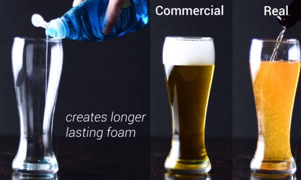 Yup, foam tebal yang kamu lihat dalam iklan bir dan minuman bersoda lainnya bisa jadi berasal dari tambahan sabun cuci piring. Duh, jangan sampai lupa terminum ya!