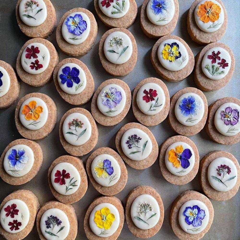 Permen panggang, jeli, kue jahe, dan aneka kue lainnya nampak cantik dengan bunga di atasnya.