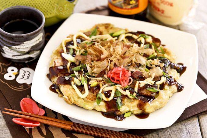 Okonomiyaki adalah pancake gurih yang disatukan dengan adonan dan diisi dengan daging dan sayuran yang biasanya diisi dengan banyak kubis, kemudian diberi saus dan mayones. Kamu dapat menemukan jajanan ini di jalanan festival lokal dan juga dijual di beberapa restoran khusus.
