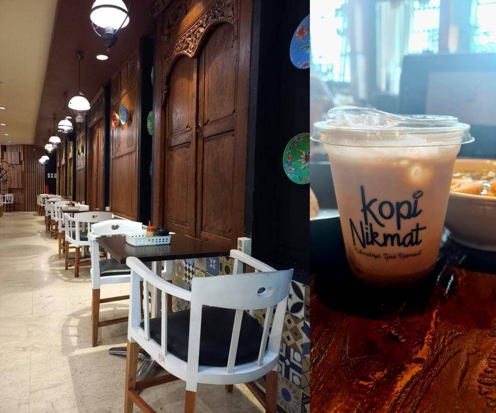Kopi Nikmat memadukan gaya tradisional dan modern. Kamu dapat dengan mudah mengenali ornamennya yang mirip teras rumah tradisional Betawi. Interiornya juga didominasi bahan kayu dan beberapa di antaranya dihiasi dengan ukiran.