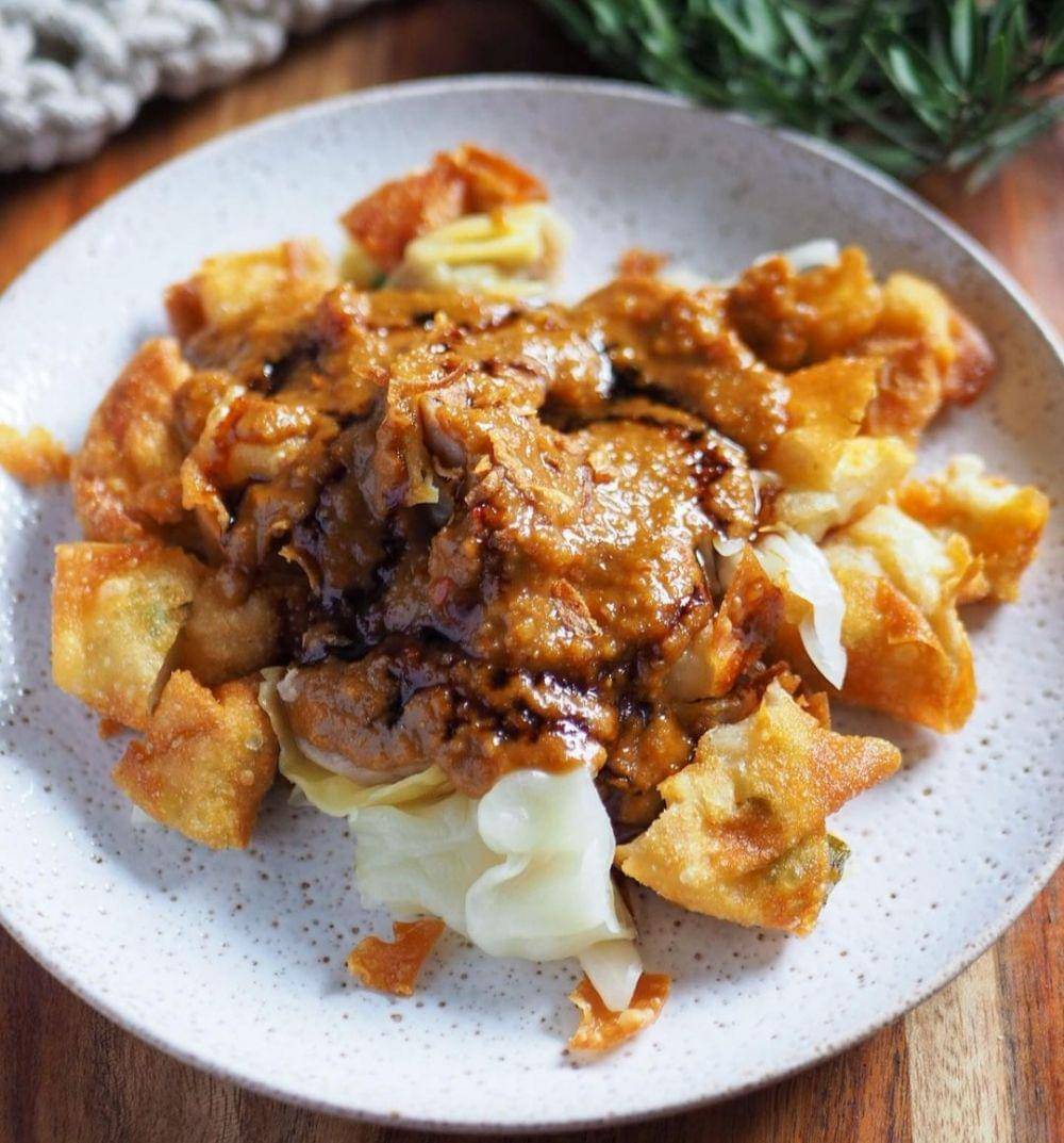 Untuk melengkapi hidangan, biasanya ditambahkan kentang, tahu, dan kol. Makanan ini menjadi camilan yang sempurna karena cara penyajiannya. Setelah digoreng, pangsit dipotong kecil-kecil dan disiram saus kacang, kecap, dan cabai.