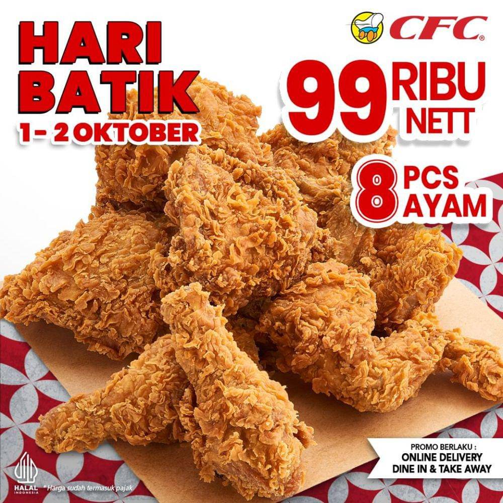 Dalam rangka menyambut Hari Batik Nasional, CF menawarkan Promo 8 Ayam hanya Rp99 ribu. Promo hanya berlaku pada 1-2 Oktober 2024 untuk pembelian dine-in, take away, dan melalui aplikasi ojek online.