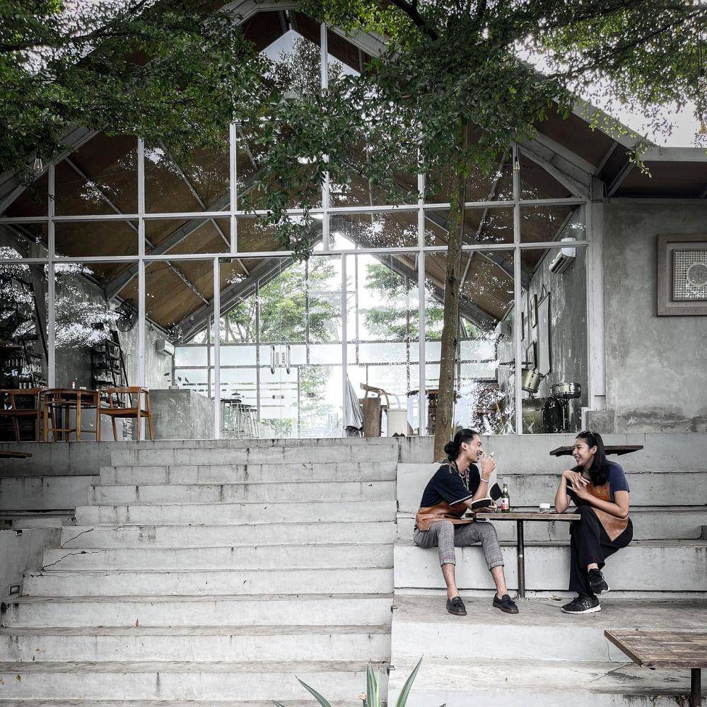 Desain Sintru Coffee di Gianyar unik dan membuat siapa pun nyaman berada di sana. Ada tempat duduk outdoor yang menyatu dengan tangga turun ke taman.