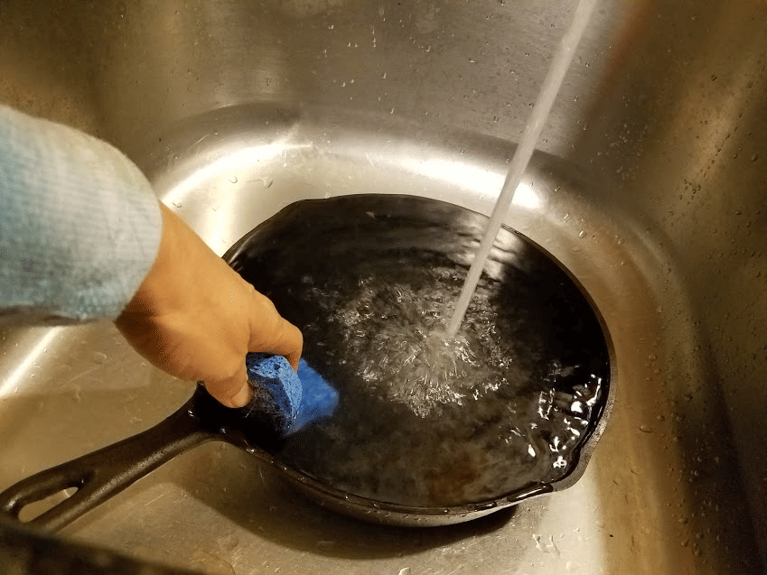 Kamu hanya boleh mencuci cast iron skillet dengan sabun saat masih baru, sebelum digunakan untuk memasak. Bilas dengan air panas yang sudah dicampur sabun, lalu buang busanya.