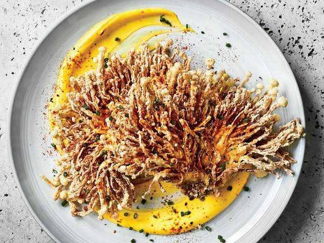 Pernahkah membayangkan bagaimana jamur enoki digoreng? Begini lah tampilannya. Jamur enoki sengaja digoreng dengan teknik deep fried hingga renyah. Tak lupa biasanya juga diberi aneka rempah yang membuat menu ini lezat dan gurih.