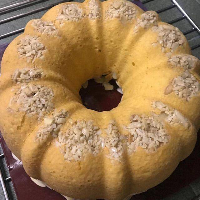 - Panaskan oven 170 derajat celcius. Siapkan loyang tulban diameter 24 cm, oles margarin dan taburi dengan terigu.