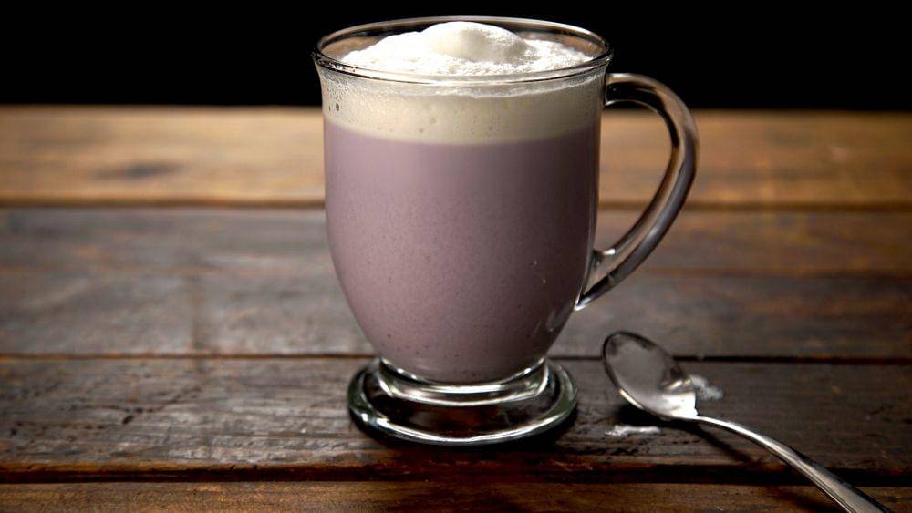 -Dalam panci masukkan susu cair, santan, sirup vanilla, air, dan ubi ungu