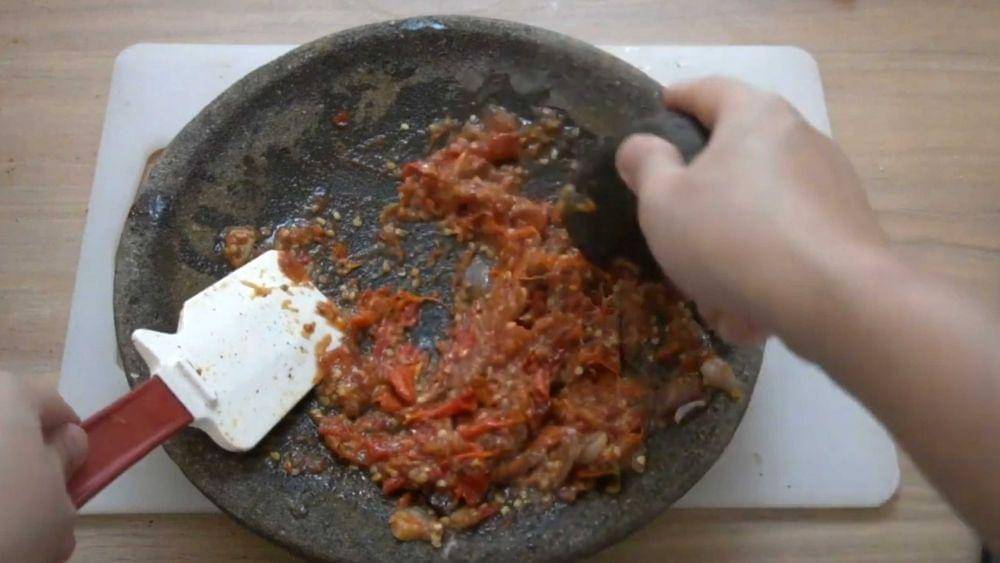 Tumis bawang merah, bawang putih, cabai rawit, cabai merah keriting, dan tomat sampai layu. Siapkan ulekan lalu masukan bumbu yang telah di tumis, garam, gula. Haluskan. Jika sudah, koreksi rasa.
