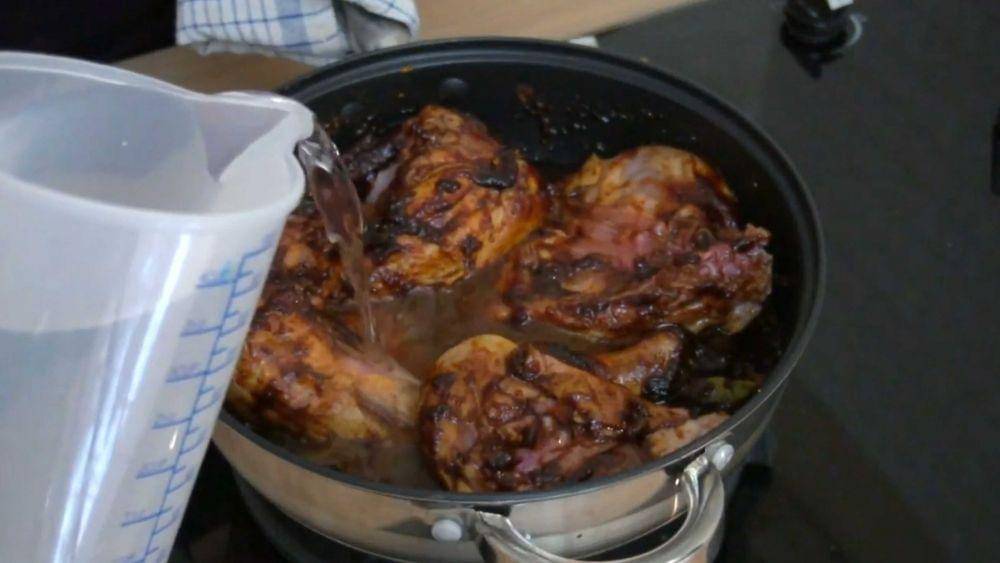Masukan ayam ke dalam wajan berisi bumbu, aduk sampai semua bagian ayam terlumuri dengan bumbu. Tuangkan air sampai ayam terendam, tambahkan garam, dan jeruk nipis. Tutup wajan lalu ungkep ayam selama kurang lebih tiga puluh menit atau sampai menyerap dengan api kecil.