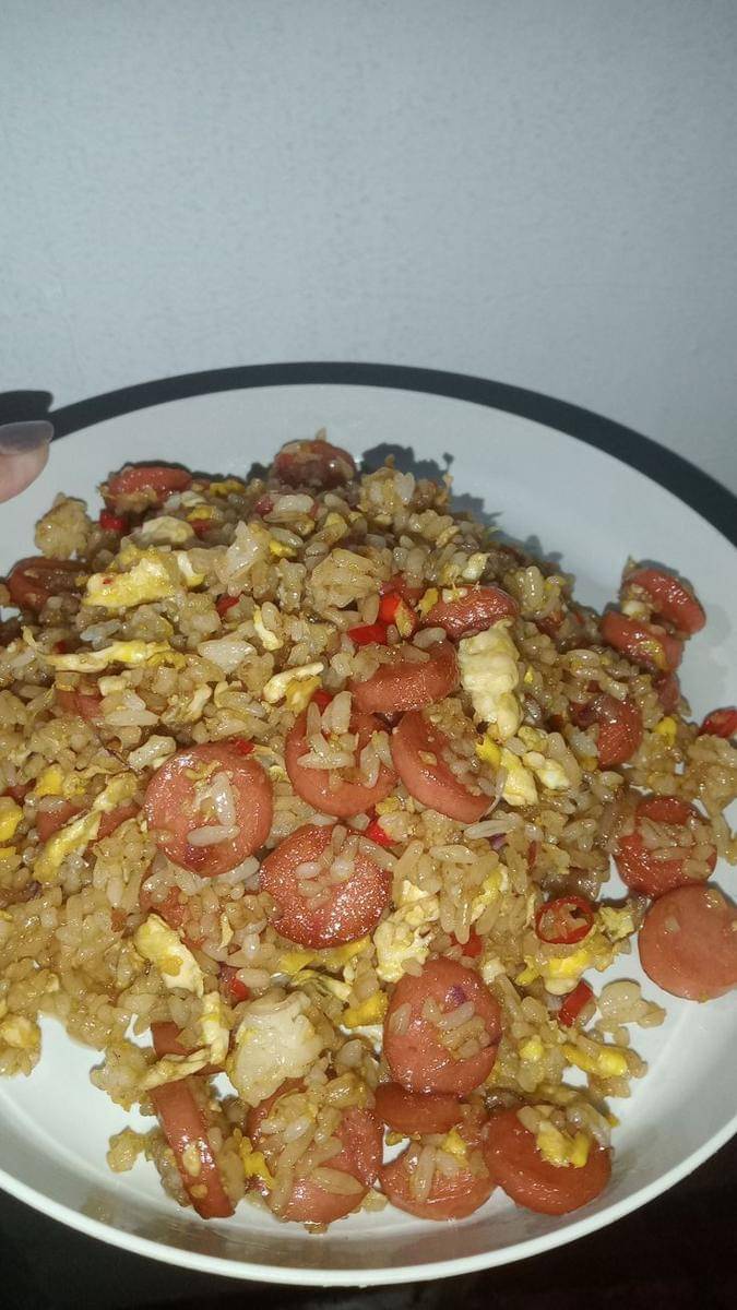 - Masukkan sosis dan telur, aduk hingga telur matang.
