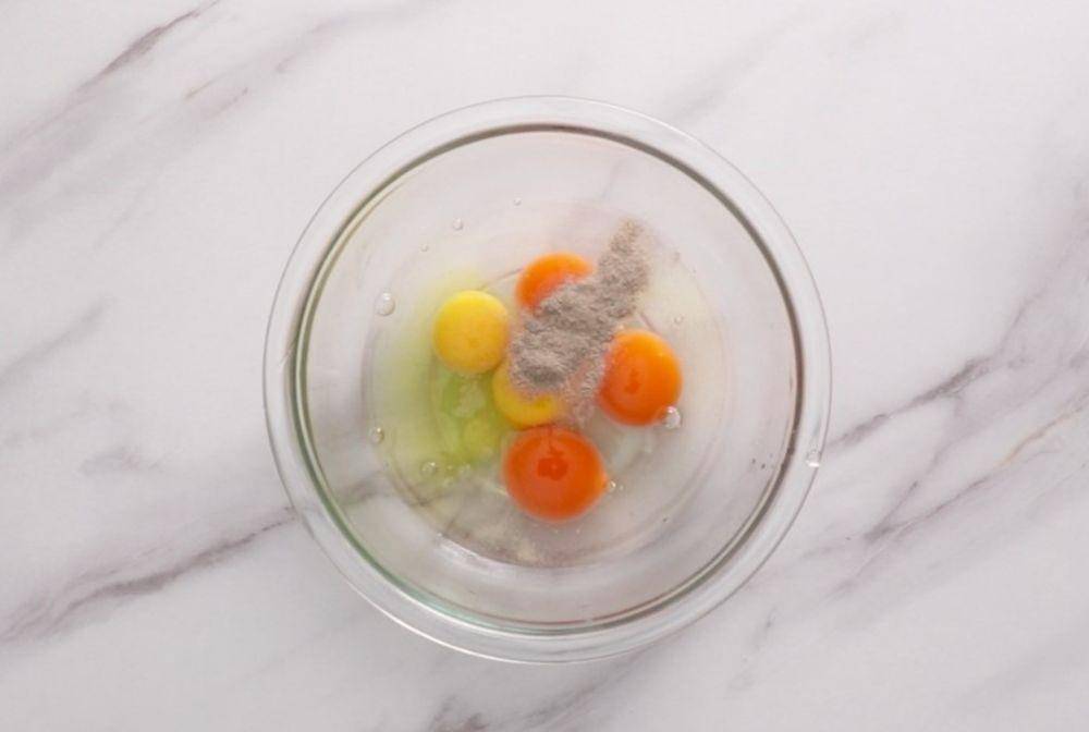 Siapkan wadah, campurkan telur bebek dan telur ayam. Bumbui dengan garam dan merica. Kocok hingga tercampur dengan rata.