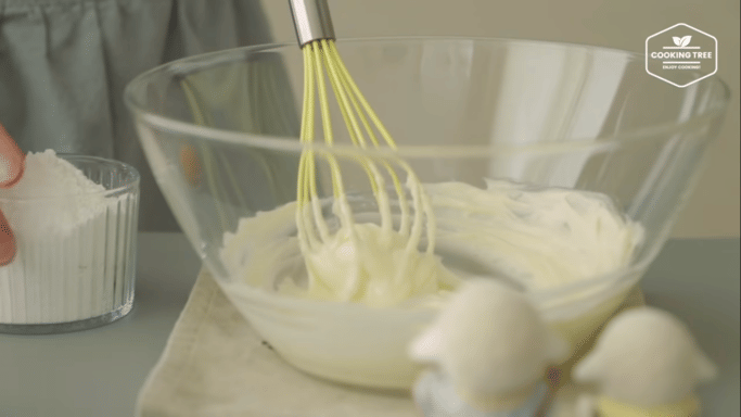 Siapkan wadah yang akan digunakan. Tuang mentega tawar dalam wadah tersebut. Aduk mentega tawar hingga teksturnya lembut. Setelah itu, tambahkan gula halus sesuai takaran. Aduk kembali hingga kedua bahan tercampur rata. Lalu, tambahkan kuning telur. Aduk kembali menggunakan whisk, lalu sisihkan.
