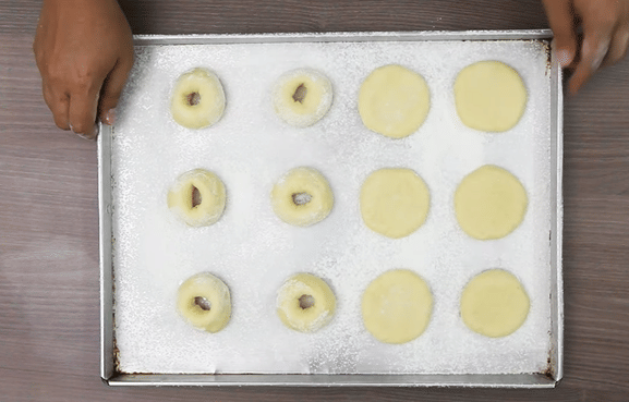 Selanjutnya, bagi adonan dengan berat masing-masing 30 gram. Taburkan tepung di atas permukaan yang bersih, lalu ratakan adonan dengan rolling pin.