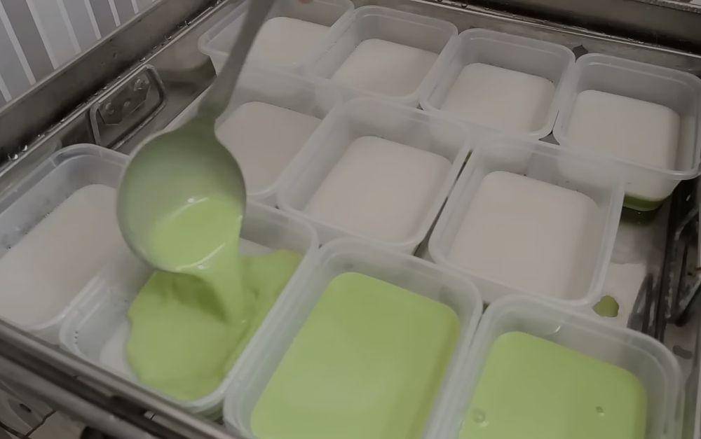 - Jika sudah, angkat dan tuangkan adonan putih di atas adonan hijau. Kukus kembali selama 5 menit.