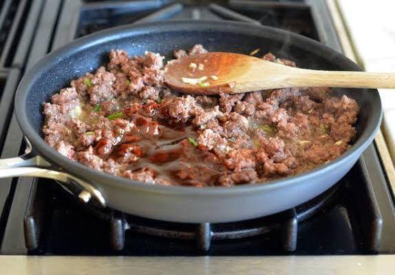 Siapkan wajan yang telah diberi minyak, lalu panaskan. Tambahkan irisan bawang bombay, bawang daun, dan daging sapi cincang ke dalamnya. Tumis semua bahan sampai mengeluarkan aroma harum, sisihkan dahulu untuk menyiapkan bahan lain.