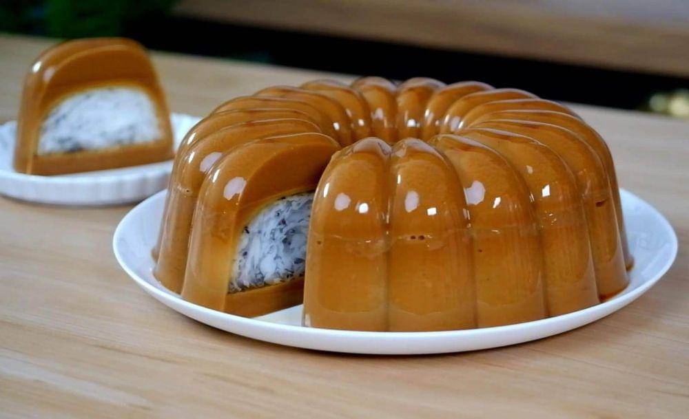 - Tutup dengan sisa adonan puding gula merah. Biarkan puding mengeras sempurna, lalu keluarkan dari cetakan.