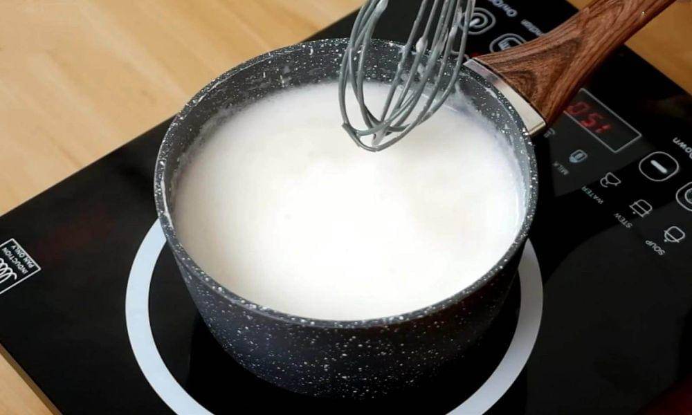 - Membuat jeli kelapa muda: Campur jeli kelapa, air, santan, dan gula pasir ke dalam panci. Aduk rata. Masak dengan menggunakan api sedang hingga mendidih sambil terus diaduk.