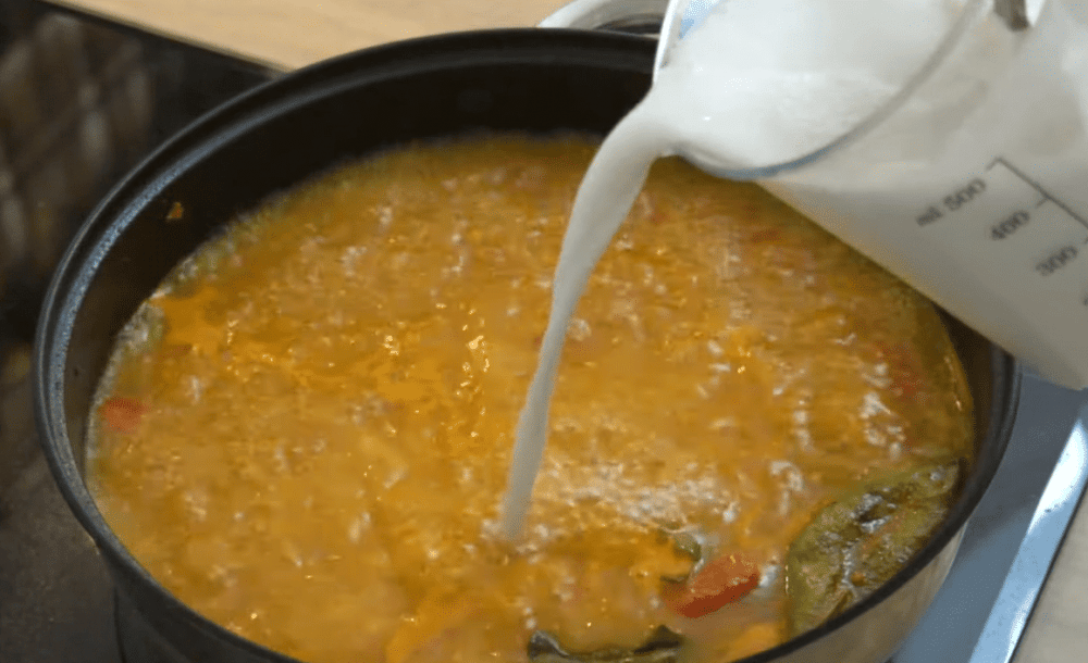 Tambahkan santan, gula merah, garam, kaldu bubuk, dan lada. Jangan lupa untuk koreksi rasanya. Jika dirasa sudah pas, kamu bisa langsung menyajikan soto tangkar bersama irisan tomat, bawang goreng, kecap, dan emping.