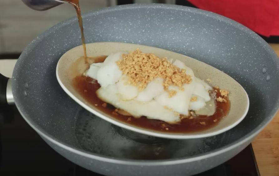 - Taburkan bawang putih goreng di atas ikan dan tuangkan sedikit saus. Kukus lagi selama 3 menit.