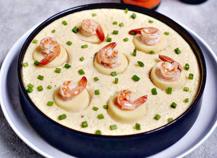Siapkan udang segar untuk menghasilkan rasa yang nikmat. Buang kepala dan kulit udangnya. Letakkan di atas tofu yang sudah ditata rapi. Saat kukusan sudah mulai beruap, tim tofu telur dalam kukusan.