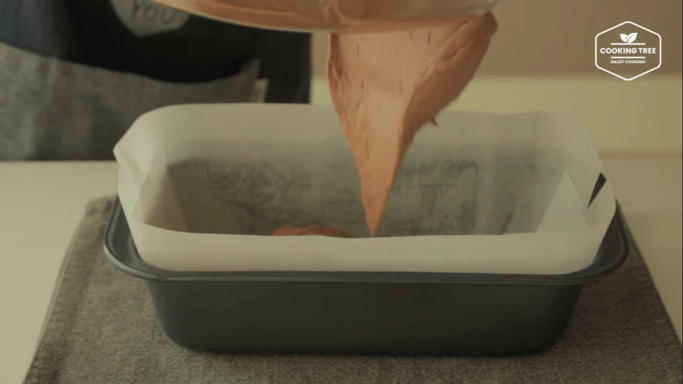 Siapkan loyang berbentuk balok dengan ukuran kurang lebih sebesar 23 cm x 11 cm x 6 cm. Setelah itu, lapisi loyang tersebut dengan baking paper yang telah dipotong menyesuaikan ukuran loyang. Kemudian, masukkan adonan kue ke dalam loyang. Ratakan menggunakan spatula.
