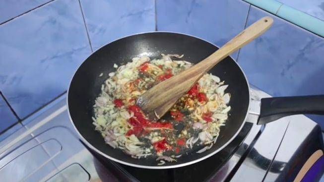 Masukkan bawang bombay, tumis sebentar. Tambahkan air secukupnya, aduk hingga merata. Masukkan tomat dan cabai merah, masak sebentar hingga mendidih.