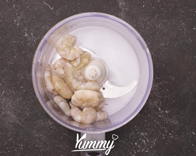 Masukkan udang, tepung maizena, jamur, bubuk jahe, bawang putih goreng, kecap asin, daun bawang, bubuk kari, lada, minyak wijen, dan gula ke dalam food processor. Campurkan semua bahan sampai merata, lalu sisihkan.
