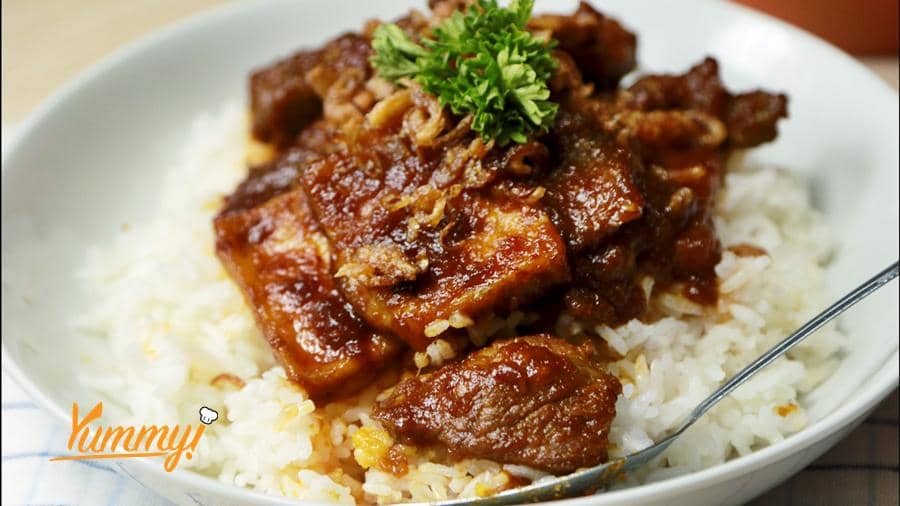 Sajikan lapis daging dengan nasi.