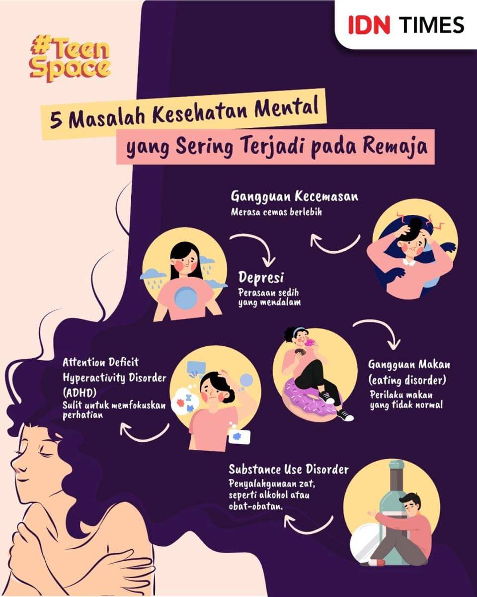 Remaja dan dewasa muda rentan mengalami gangguan kesehatan mental. Lima gangguan kesehatan mental yang perlu diwaspadai meliputi gangguan kecemasan, depresi, ADHD, gangguan makan, dan gangguan penyalahgunaan zat.