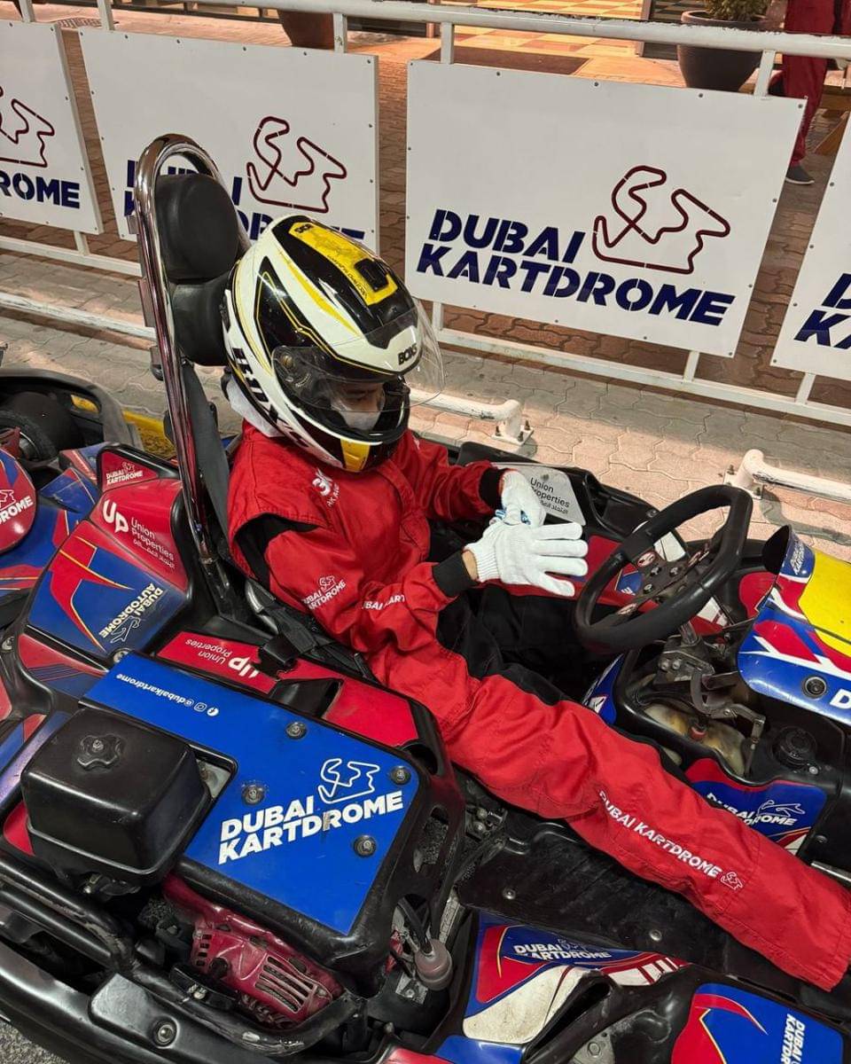 8. Azizah juga mencoba mengendarai go-kart di Dubai Outdoor Kartdrome. Lengkap dengan busana khusus, helm dan sarung tangan!
