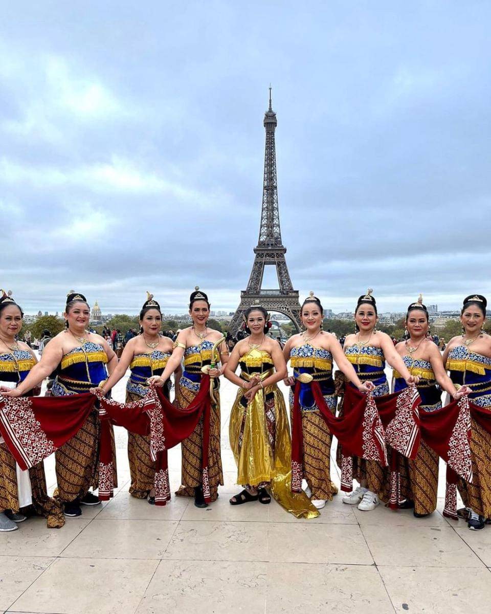 Ira Wibowo dan beberapa rekan lainnya pun menari serimpi dengan latar Menara Eiffel. Seperti apa ya penampilan Ira dan kawan-kawannya ini?