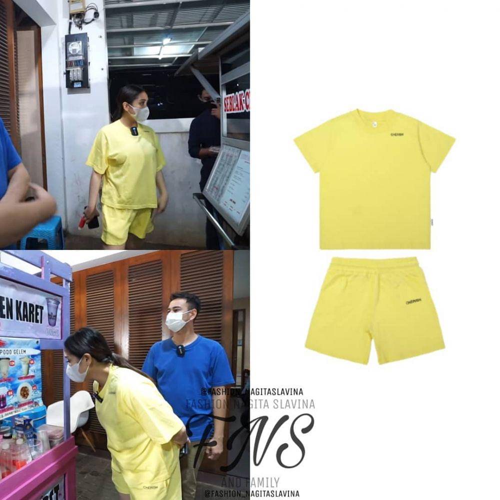2. Masih warna kuning, saat syuting vlog jajanan, Nagita memilih mengenakan short sleeve one set yang dibanderol Rp250 ribu saja. Masih terjangkau, kan?