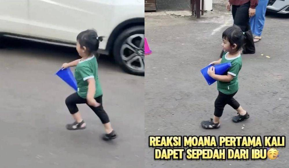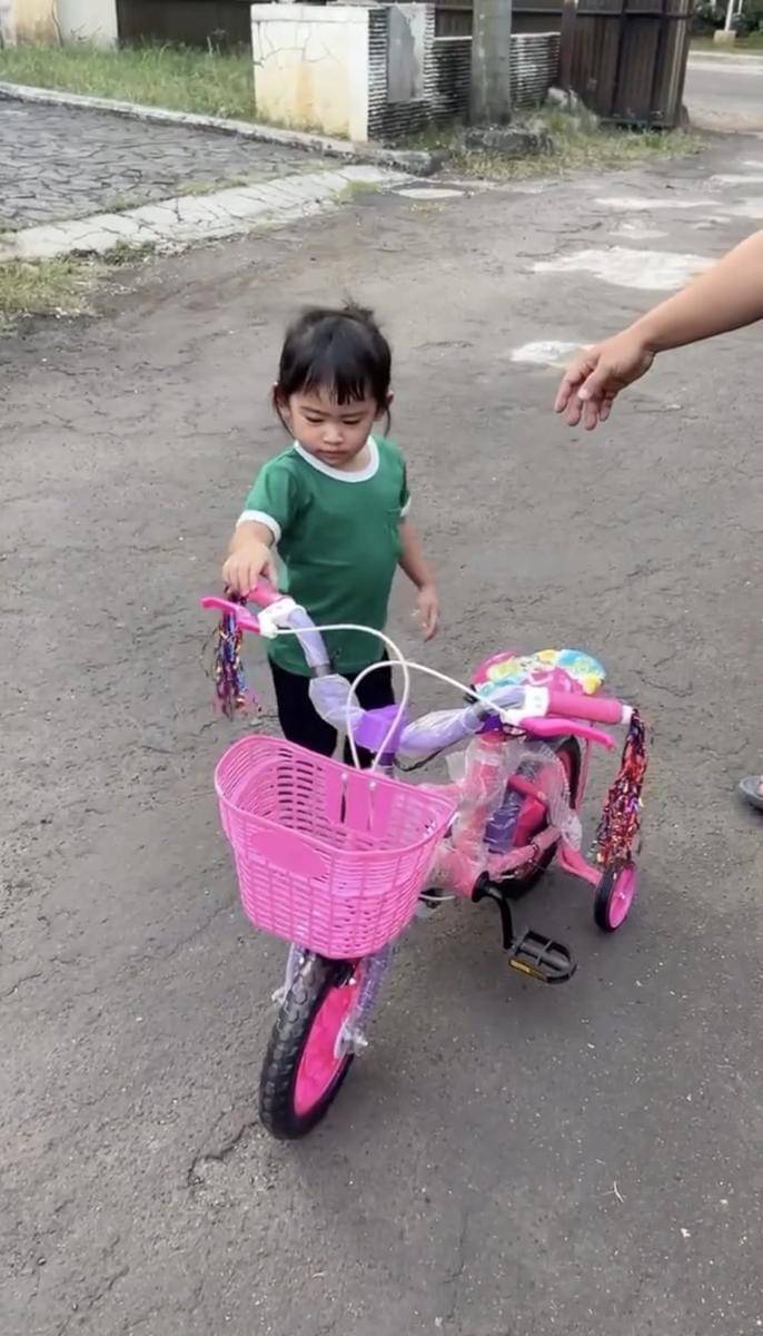 Sepeda memang sering jadi hadiah menarik untuk anak-anak. Seperti Moana, ia begitu girang dan bahagia saat mendapat hadiah sepeda dari sang mama. Moana juga terlihat antusias dan langsung ingin mencobanya hingga bisa gowes sendiri.