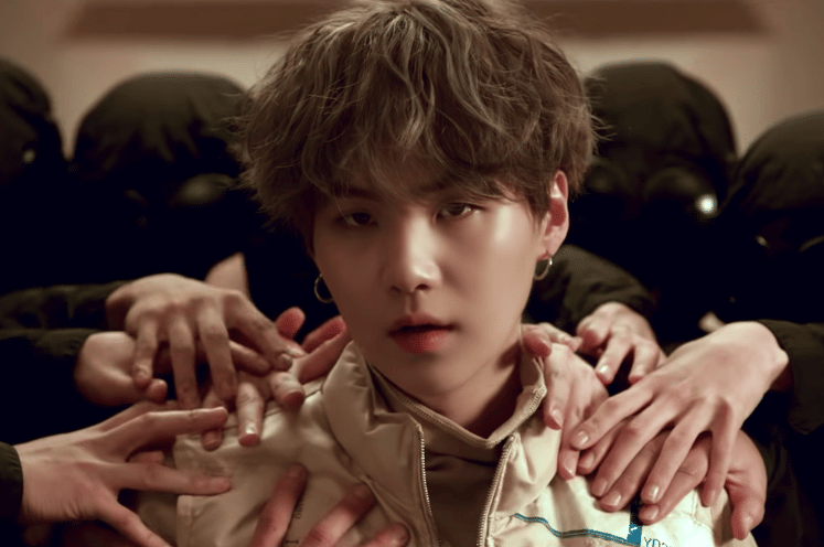 Ternyata konsep yang sama juga muncul pada comeback trailer kali ini. Suga terlihat berada di atas panggung transparan dengan banyak bayangan tangan di bawahnya. Terlihat seram, ya?