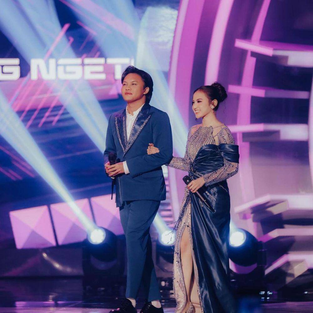 8. Tampil serasi dengan busana warna biru di sebuah acara televisi, Rizky Febian dan Mahalini saling melempar senyum manis