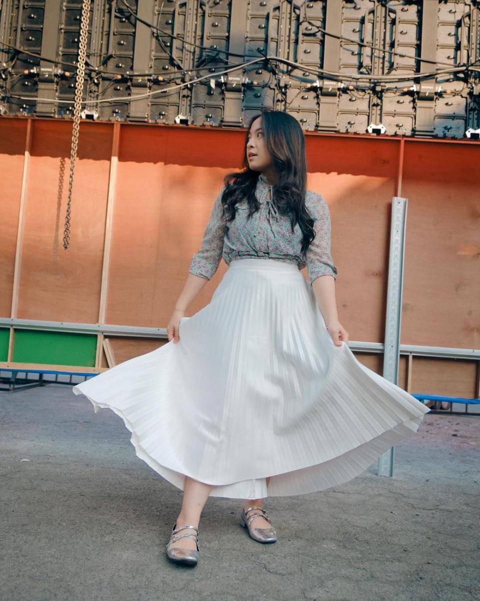 3. Warna pastel memang paling juara dikombinasikan dengan rok plisket putih. Cocok untuk tampilan formal, lho!