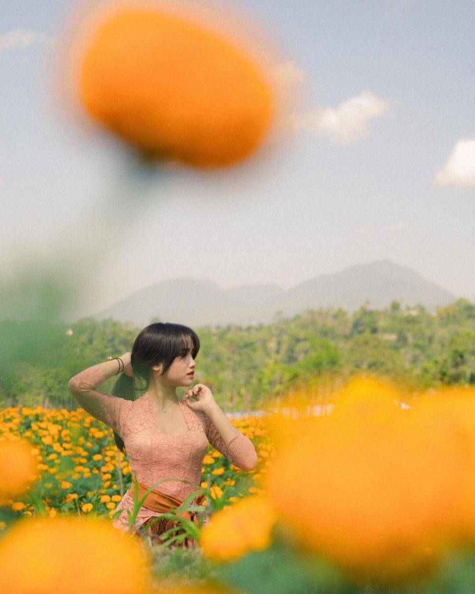 1. Fuji terlihat berada di sebuah kebun bunga marigold yang sangat luas. Kebun ini terletak di daerah Gemitir, Bali