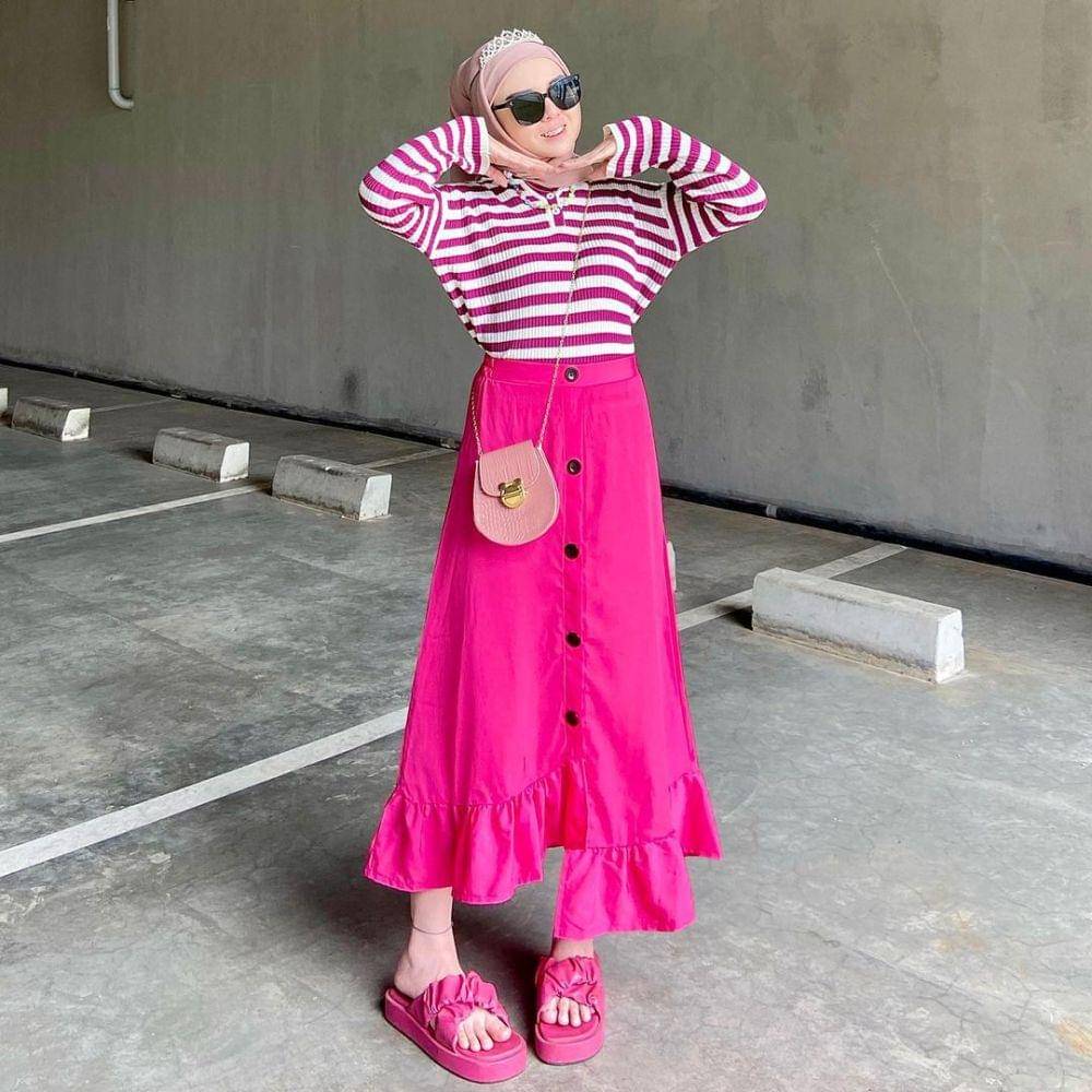 6. Pakai outfit serba pink dengan kombinasi kemeja garis dan rok warna pink yang super gemes, ini sih style ala barbie banget nih
