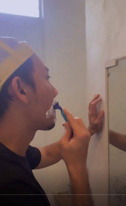 2. Bukan di rumah, Densu terlihat mencukur kumis dan jenggotnya di sebuah toilet kecil