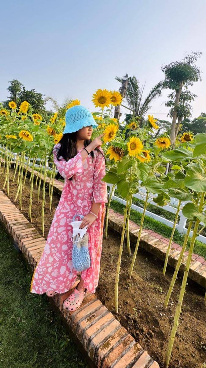7. Puas liburan di candi Borobudur, saatnya Jizzy menikmati keindahan taman bunga matahari. Jizzy tampak kece dengan balutan long dress pink dan bucket hat