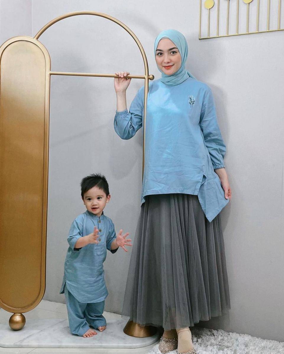 8. Kembaran dengan putranya, penampilan Ciki terlihat menawan dengan atasan berwarna biru muda