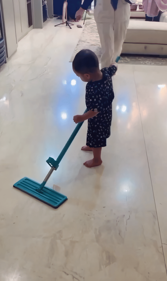 Kegiatan orang dewasa lainnya yang baru-baru ini ditiru oleh Rayyanza hingga membuat orang di sekitarnya merasa gemas adalah ngepel. Seolah paham fungsi dari alat pel tersebut, Rayyanza pun tampak semangat mengitari rumah sembari menggosokkan alat pel tersebut pada lantai.