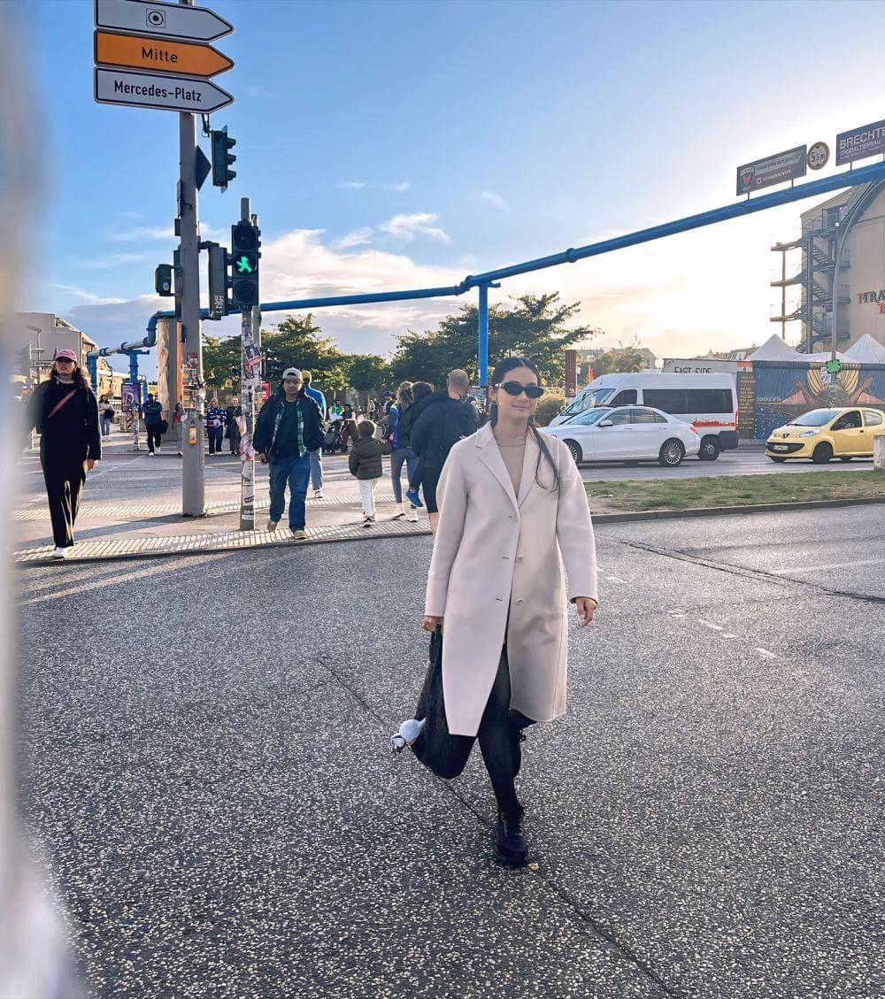 Rini terlihat sangat menawan dengan outfit warna cream dan hitam. Seperti apa sih potret Rini saat jalan-jalan di Berlin?