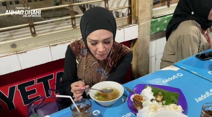 7. Sama seperti sang suami, Mulan yang mengenakan hijab hitam tampak menikmati makanannya