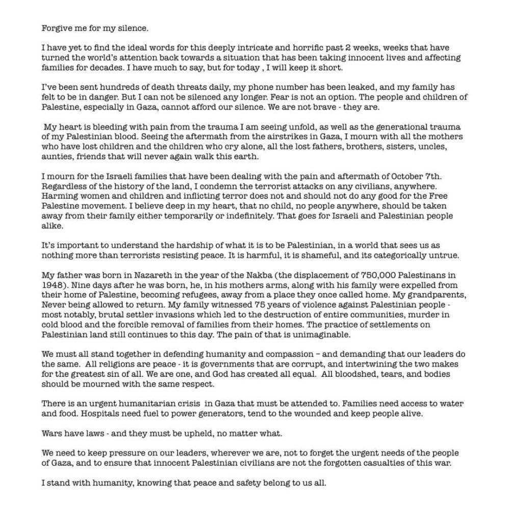 Adik dari Gigi Hadid ini pun meminta orang-orang memahami bahwa menjadi seorang Palestina, terutama di dunia yang melihat mereka hanya sebagai teroris yang menolak damai, tidak pernah mudah. Bagi Bella, hal itu sangat menyakitkan. Ia juga menceritakan masa lalu kelam keluarganya di Palestina.