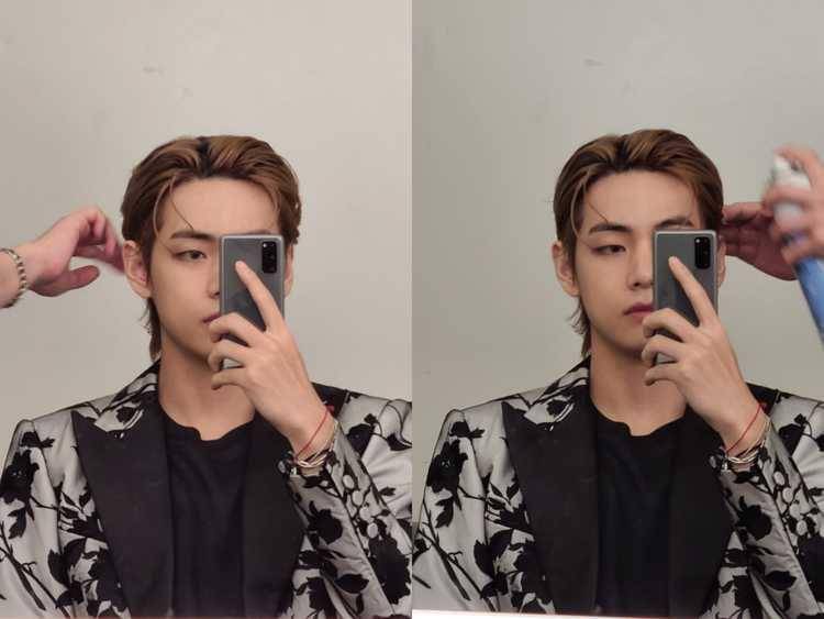 9. Kenakan jas abu-abu motif floral, V sempat kuasai trending topic di Twitter dengan mirror selfie-nya ini. Terlihat manly, kan?