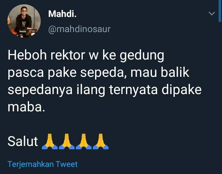 1. Kira-kira gimana reaksi si maba, ya, pas tahu kalau sepeda yang dipake punya rektor?