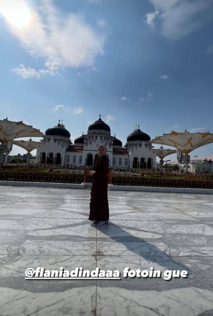 4. Gaya instagramable Dara Arafah saat berkunjung ke tempat ibadah sekaligus saksi kedahsyatan tsunami Aceh 2004 ini